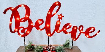 Red metal "Believe" expression, accented with fairy lights, wood base decorated with
