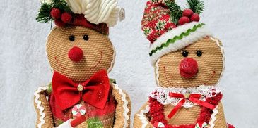 Assorted male/female gingerbread plush, red/green pinwheel button, hat with holly decoration.