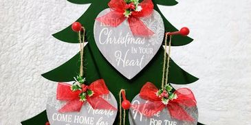 Heart ornaments with Holiday/inspirational expressions, red bow and holly decoration.