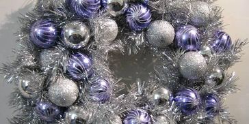 Silver/purple shiny/glitter round Christmas balls on silver tinsel wreath.