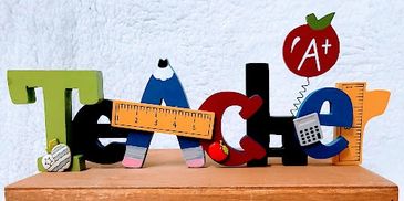 Wooden letters that spell "Teacher" with ruler, heart, A+ apple, and calculator decorations.